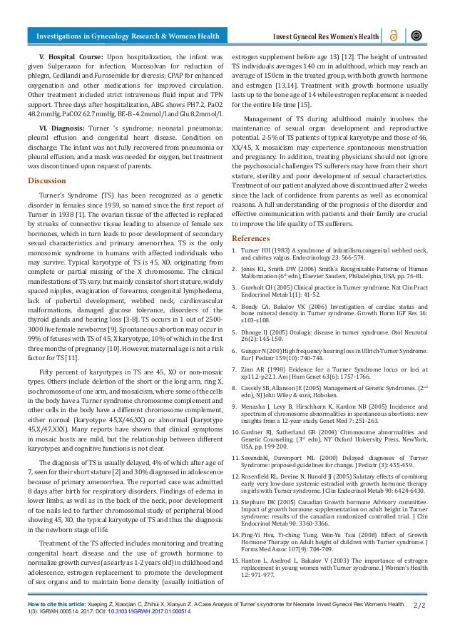 At four months old I was diagnosed with a condition called Turner Syndrome. Who is 7 years and 5 months old at the time this case study was made. Here we report a rare case of TS with GD accompanied by hypogonadotropic hypogonadism. A female with a normal genetic make-up has two X-chromosomes in each of her cells one which she received from. The patients external genitalia were juvenile with a pubertal state of A1M1P1 Tanner staging. Patients with Turner Syndrome are more likely to develop chronic ear infections which may result in scarring and thus hearing loss Bois et al 2018. A Case Study by. Turner syndrome is a common chromosomal abnormality occurring in approximately 1 in 2000 live-born female infants. The disorder in lymphatic development is manifested in the newborn as a peripheral lymphedema back of the hands and feet and webbed neck.