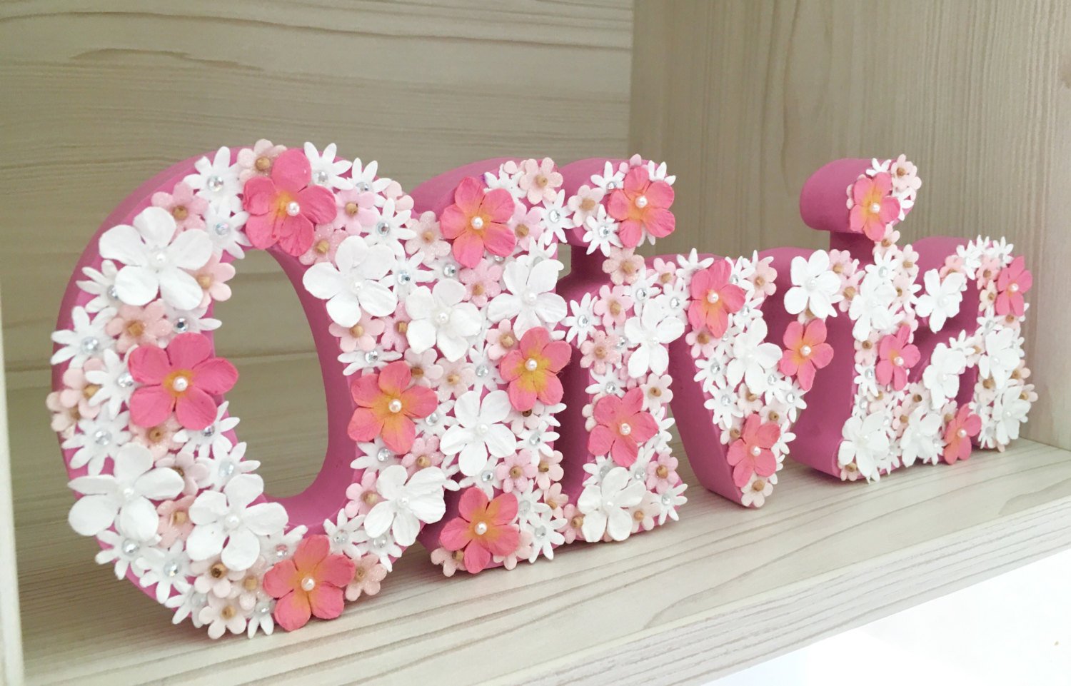 The sign is light-weight and will pop onto nails tucked behind the flowers. I just love this floral name plaque.